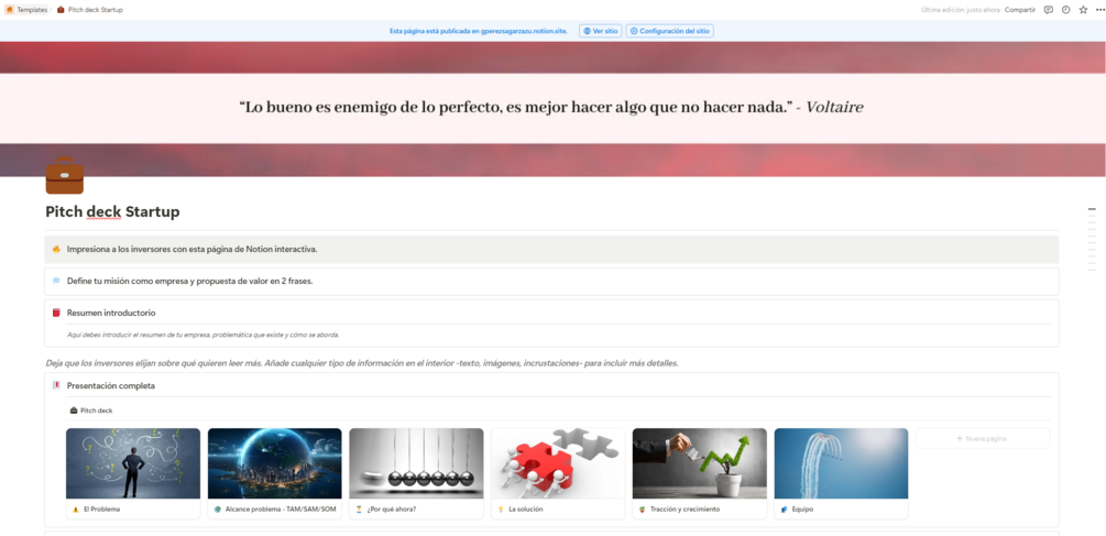 Muestra la visión de tu startup con la plantilla Presentación de startup de Notion, diseñada para presentar de manera convincente tus ideas de negocio, análisis de mercado y planes estratégicos a posibles inversores y socios.